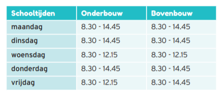 Één keer per week gaan de deuren om 8.20 uur open. U bent van harte welkom om uw kind naar de klas te brengen. Om 8.30 uur starten de lessen bij ons op school. De dag waarop u uw kinderen de school in mag brengen, wisselt per vakantie. Dit om alle ouders de gelegenheid te geven om een periode uw kinderen naar de klas te brengen.